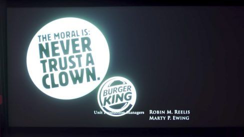 A campanha foi utilizada ao final da estreia de “It” em alguns cinemas da Alemanha. Intitulada de “Never Trust a Clown”, a mensagem foi projetada logo após o termino do filme: “Moral da história: nunca confie em um palhaço”, em clara alusão ao ícone do seu maior concorrente, o McDonald’s e seu palhaço Ronald. A criação é da Grabarz & Partner.
