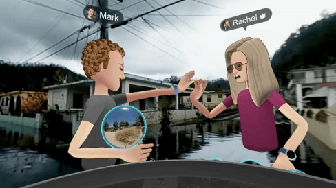 Depois de uma sequência de conversas desagradáveis sobre como os dois se sentem como se estivessem realmente em Porto Rico, com pausas desconfortáveis marcadas por Zuck ajustando a câmera virtual para mostrar as ruas “completamente inundadas”, o fundador do Facebook questiona sua colega se ela quer se “transportar” para qualquer outro lugar.