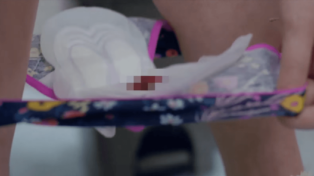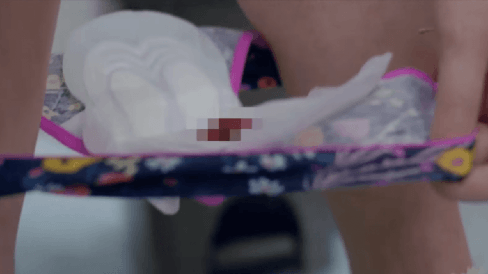 Em determinando momento um líquido vermelho é despejado no absorvente e somos apresentados à diversas situações em que a menstruação está presente.
