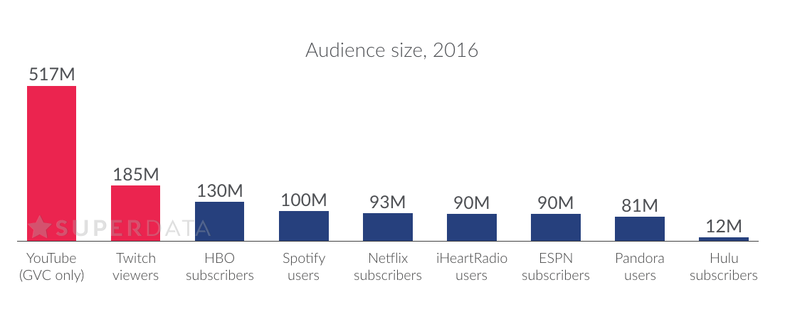A expectativa é que sozinhos o YouTube Gaming e o Twitch em 2017 podem concentrar 60% de audiência contra 40% de todos os outros serviços juntos. Isso inclui, além do Netflix, HBO, Hulu, Spotify, Pandora, iHeartRadio e ESPN