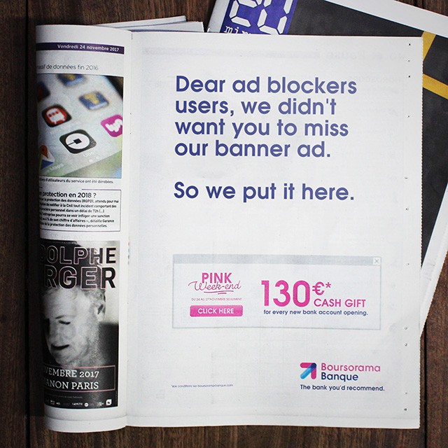 Sabendo que grande parte de seus clientes utilizam o recurso de AdBlock na internet, um banco francês resolveu levar a propaganda da web para a versão impresso.