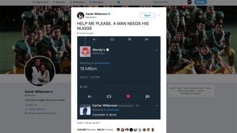 O tweet mais compartilhado no mundo e 2017 é o do jovem Carter Wilkerson, que lançou um desafio para a Wendy’s. Carter perguntou em tom de brincadeira quantos RTs (retuítes) seriam necessários para que ele ganhasse nuggets da rede de graça por um ano. A resposta da Wendy’s foi 18 milhões de RTs.