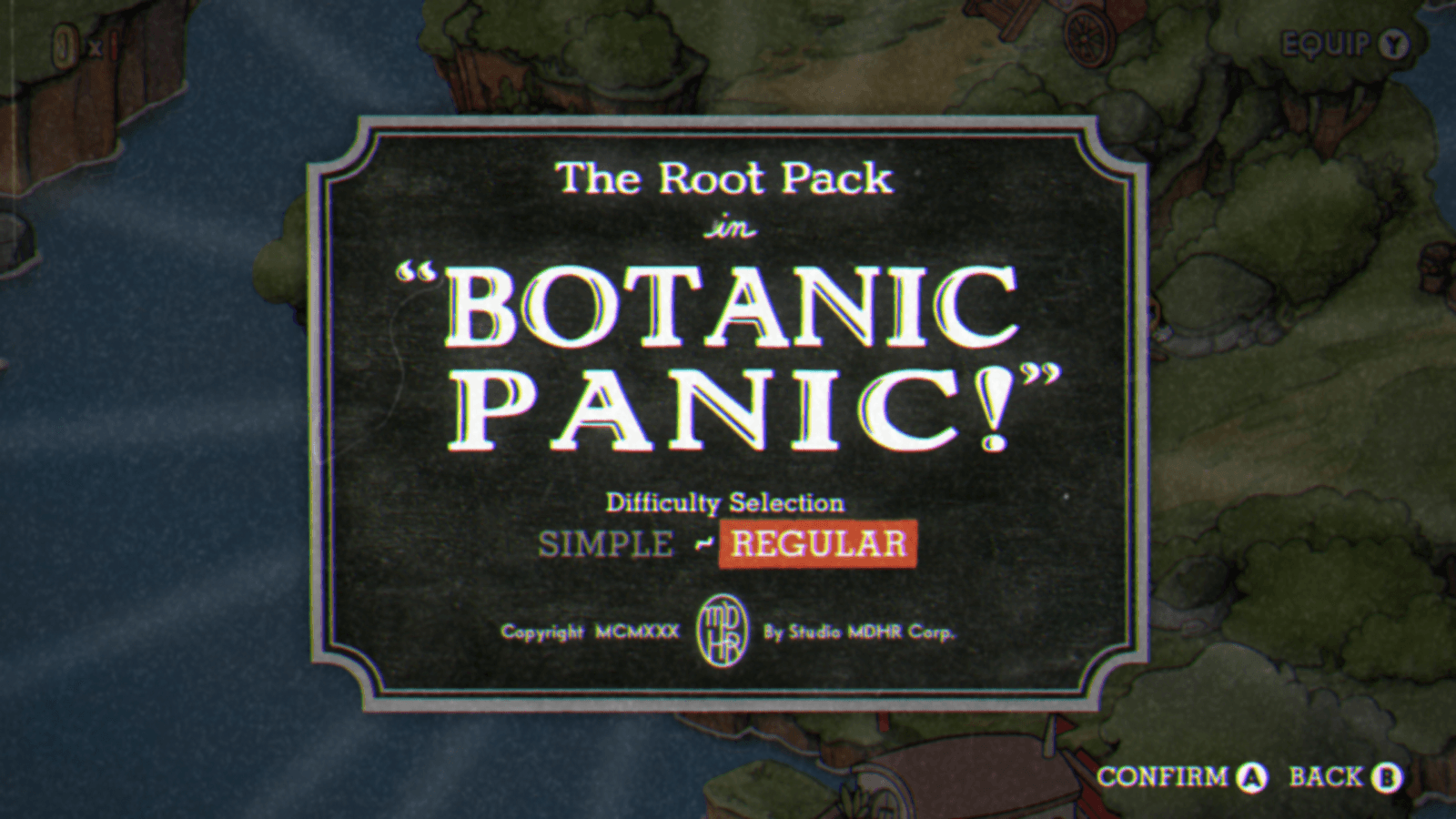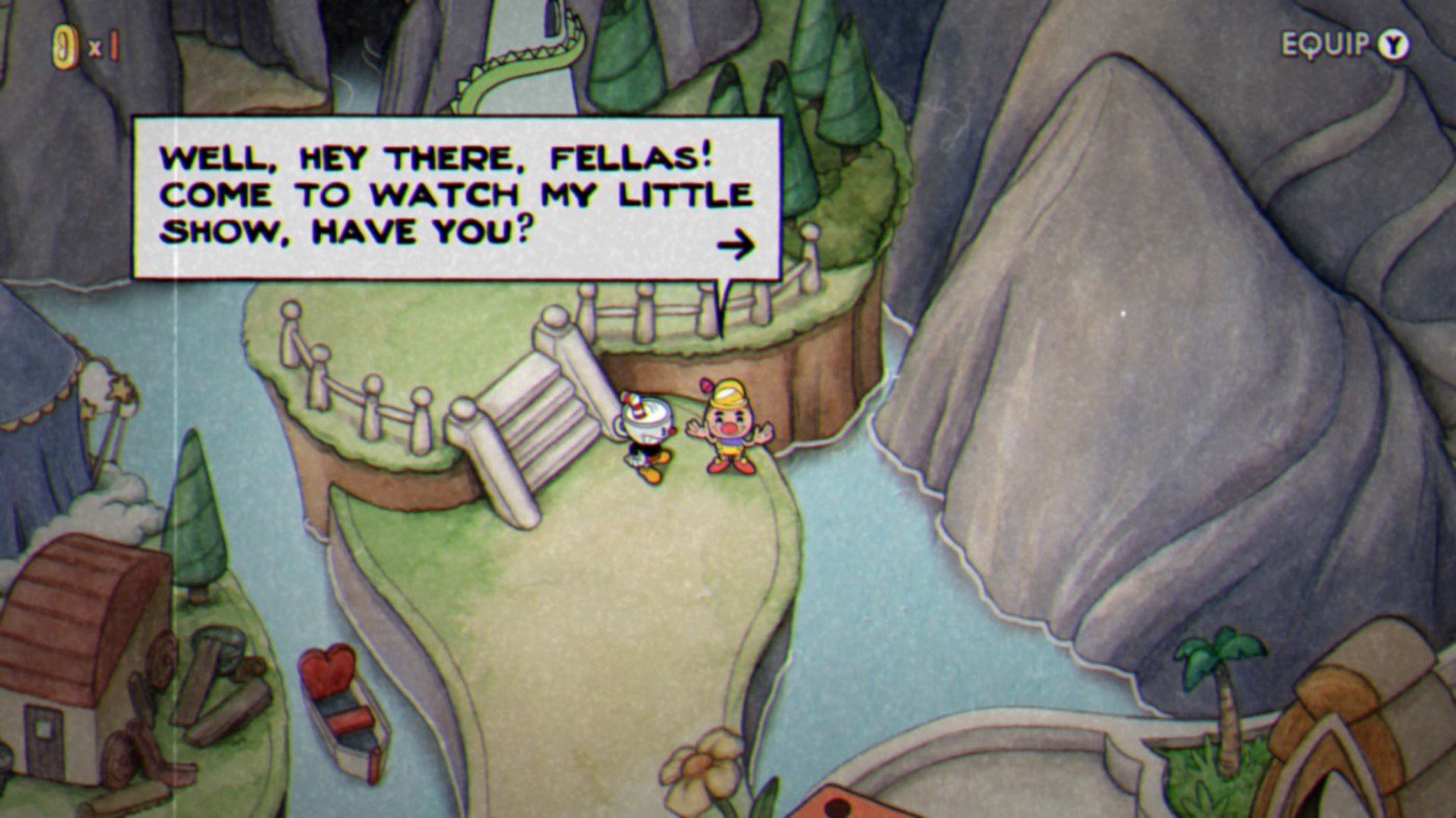 “Cuphead” se utiliza dos dois recursos. Por exemplo, o título da imagem acima — “A KNOCKOUT!” é um lettering — , onde cada caractere foi pensado especificamente para a composição deste título, no qual a palavra é composta por uma curva crescente da esquerda para a direita (note como as duas letras “K” são diferentes uma da outra nesse contexto). Já os balões de fala, os menus e outros textos de comunicação do jogo são compostos por fontes (caracteres sistematizados para serem capazes de escrever qualquer palavra).