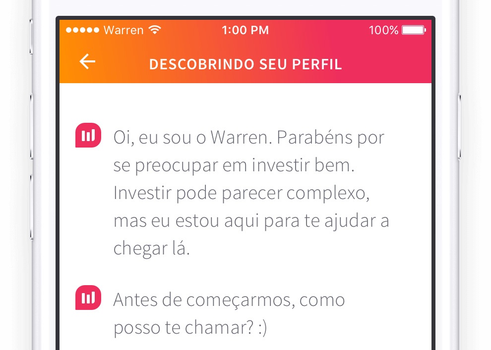 Pra começar, é quase como se você estivesse em uma conversa no WhatsApp. Através do site ou aplicativo, o Warren vai fazer uma série de perguntas para definir o seu perfil. Depois disso, vai te guiar pelo que é o segredo de todo bom investidor: definir metas e objetivos.