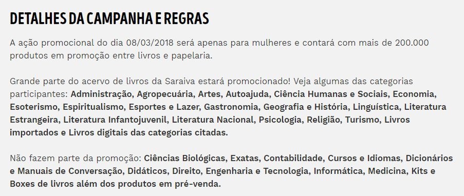 Entendemos completamente que kits e boxes de livros, assim como produtos em pré-venda estão fora da promoção. É até comum isso. Mas fica aqui a dúvida de categorias como Direito, Engenharia e Tecnologia, Medicina, Informática e alguns outros temas não merecerem ser comprados com desconto pelas leitoras.