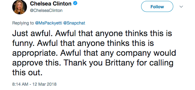 Não demorou para que os próprios usuários da rede social se sentissem incomodados e questionassem a intenção da publicidade. Chelsea Clinton, advogada e filha do ex-presidente Bill Clinton e da senadora Hillary Clinton, manifestou sua indignação via Twitter, enfatizando o quanto a situação era horrível.