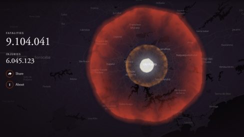 Já que a ideia da organização é educar, vamos seguir o modelo e explicar o funcionamento de sua criação por um exemplo. Se digitarmos no site o endereço da Avenida Paulista e selecionarmos o modelo de bomba mais potente já detonada (a russa Tsar) e o alcance no solo, temos o seguinte resultado: