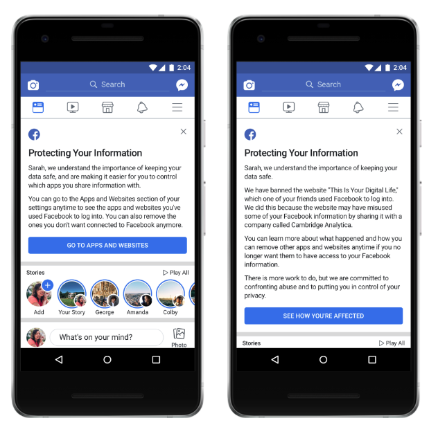 Os usuários afetados pela violação de dados da Cambridge Analytica verão uma mensagem igual a da direita, maior e mais detalhada já com o nome do app que compartilhou as informações. Já aqueles que não foram afetados verão a mensagem igual a da esquerda.