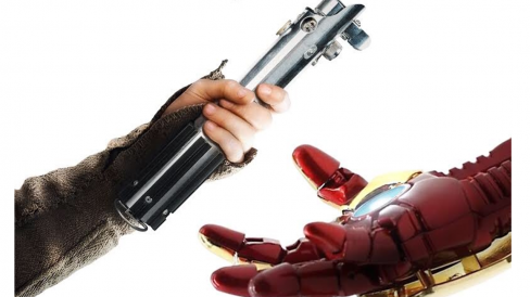No cartão vemos a mão de Rey passando um sabre de luz para o Homem de Ferro, tudo acompanhado da mensagem: “De uma galáxia muito muito distante… para os maiores heróis da Terra, parabéns pela maior estreia da história“.