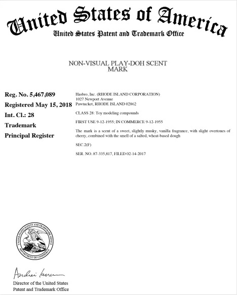 Os cheiros das massinhas da marca Play-Doh agora não podem mais ser copiadas oficialmente. A fragrância foi registrada hoje pela Hasbro no Escritório de Patentes e Registros dos Unidos, se tornando agora um bem pertencente única e exclusivamente à fabricante de brinquedos.