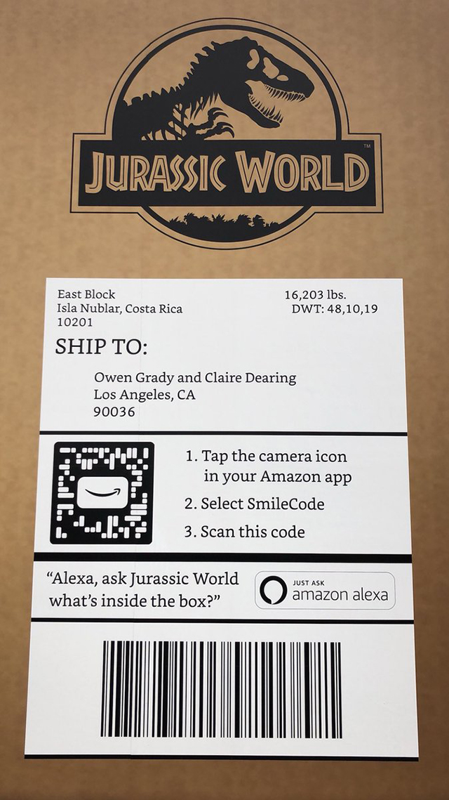A ativação em torno da ação é relativamente simples. Quando estacionado e observado com mais calma, o caminhão traz no pacote os detalhes do pedido (abaixo) que não só revelam como remetente os atuais protagonistas da franquia Owen Grady e Claire Dearing (interpretados respectivamente por Chris Pratt e Bryce Dallas Howard) mas também trazem duas seções interativas. O primeiro é um SmileCode, que quando escaneado pelo aplicativo da Amazon leva a uma página especial do site com produtos da marca “Jurassic Park” com descontos, além da exibição do vídeo acima.