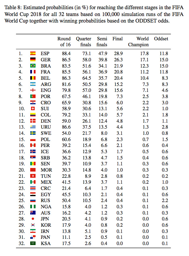 Atrás da Espanha, os países com mais chances de levar a taça, de acordo com as simulações, são Alemanha, Brasil, França e Bélgica. E ainda considerando as simulações, seria uma disputa acirrada, já que os espanhóis venceram apenas com 17.8% de chance, uma diferença mínima para a segunda colocada, a Alemanha, que teve 17,1%. Já o Brasil ficou com 12,3%, França com 11,2% e a Bélgica com 10,4%.