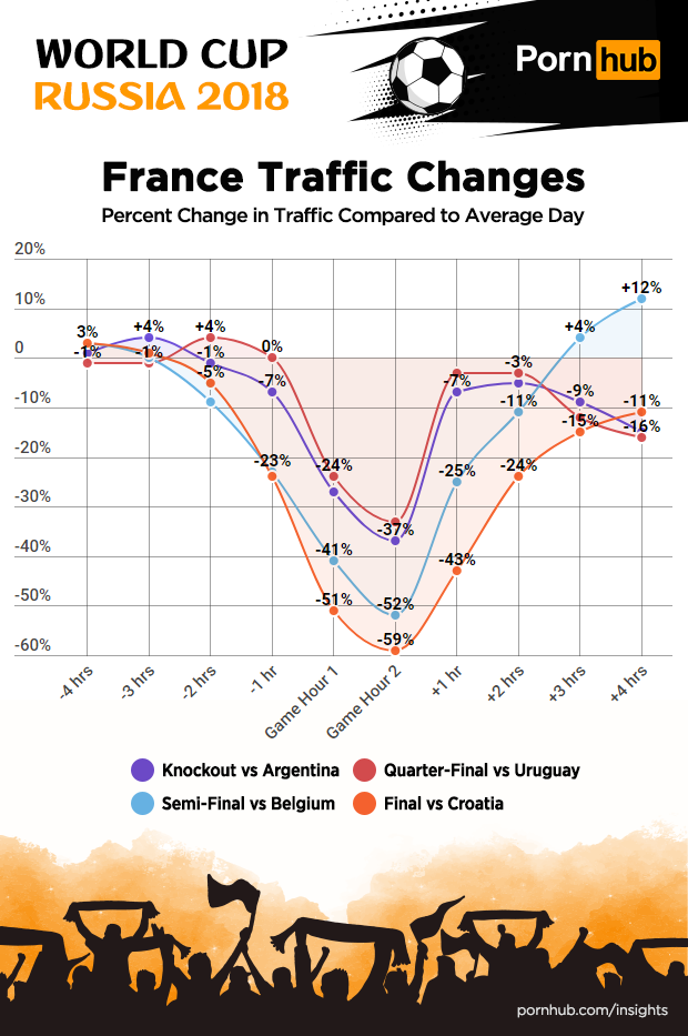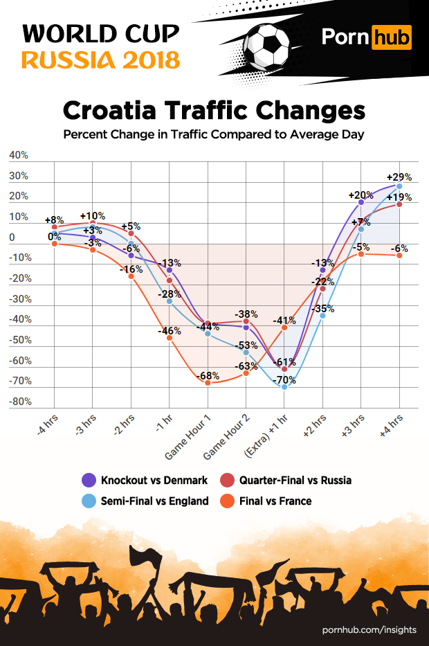 O Pornhub também divulgou estatísticas sobre as flutuações de audiência cada um dos finalistas durante os jogos do mata-mata, o que revela como o desempenho dos times afetou o comportamento dos usuários. Se no lado croata cada partida registrava quedas vertiginosas durante o jogo e retornos rápido ao site depois do fim (talvez por conta das passagens agonizantes da seleção, que passou por três tempos extras na fase eliminatória), os franceses deixaram menos a pornografia nas oitavas e nas quartas, só abandonando de vez o site nas últimas duas – e decisivas – partidas.