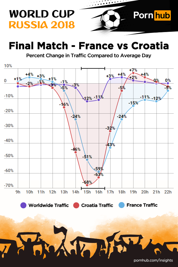 Esta última foi confirmada pelo Pornhub, site de pornografia que revelou como se deu seu tráfego durante a realização do encerramento do torneio da FIFA. De acordo com dados liberados pela empresa, sua audiência caiu vertiginosamente em todo o globo enquanto a final acontecia, especialmente nos países que ficaram mais tempo na disputa pela taça. O público brasileiro curiosamente é um dos que menos deixou de lado a pornografia: enquanto os finalistas França e Croácia lideram com quedas de até 66% nas visitas ao site (seguidos pela Venezuela, a Bulgária e a Eslovênia, países que nem chegaram a se classificar), o Brasil teve uma mera barrigadinha descendente de 21% nos acessos. O ranking abaixo elenca os países onde o Pornhub mais sofreu com a final da Copa: