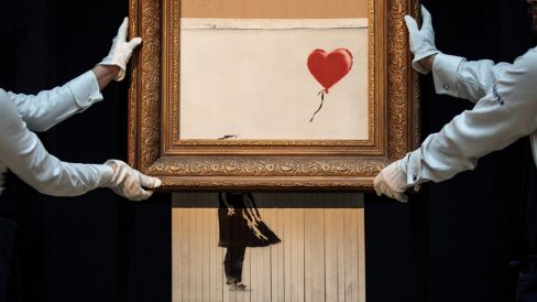 Na ocasião, a obra foi arrematada por pouco mais de 1 milhão de libras (cerca de R$ 5,05 milhões) na casa de leilões Sotheby’s, em Londres. Ao bater o martelo da venda no fim do leilão, o quadro começou a deslizar por uma trituradora de papel escondida em sua moldura e ficou parcialmente rasgado.