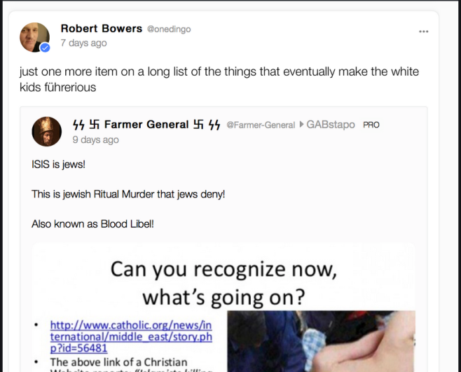 O perfil de Bowers no Gab é cheio de referências à fake news, teorias da conspiração e muitos insultos à comunidade judaica. Sua própria biografia no site traz a frase: “Os judeus são filhos de Satanás”.