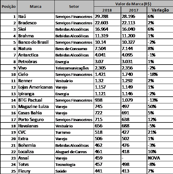 De acordo com o estudo, quinze das 25 marcas listas apresentaram uma variação positiva em relação ao ranking do ano passado, mas apenas quatro cresceram dois dígitos percentuais em seus valores: a Magazine Luiza, que aumentou seu valor em 50% e é o crescimento mais expressivo de uma marca desde 2013; a CVC (21% de valorização), a Porto Seguro (12%) e a Localiza (10%).